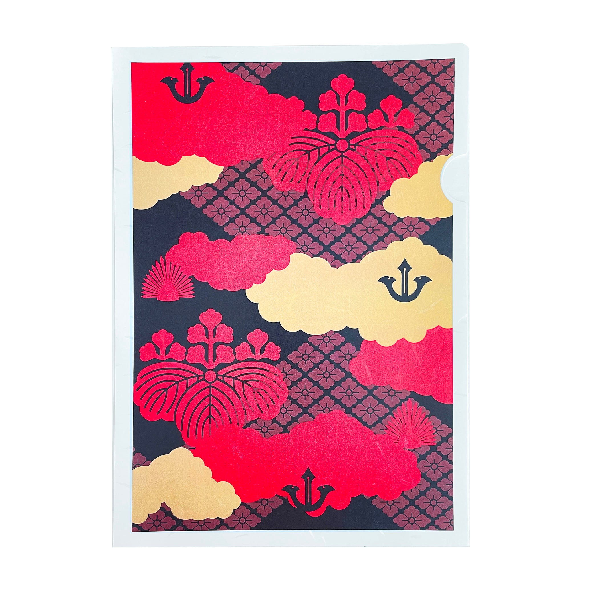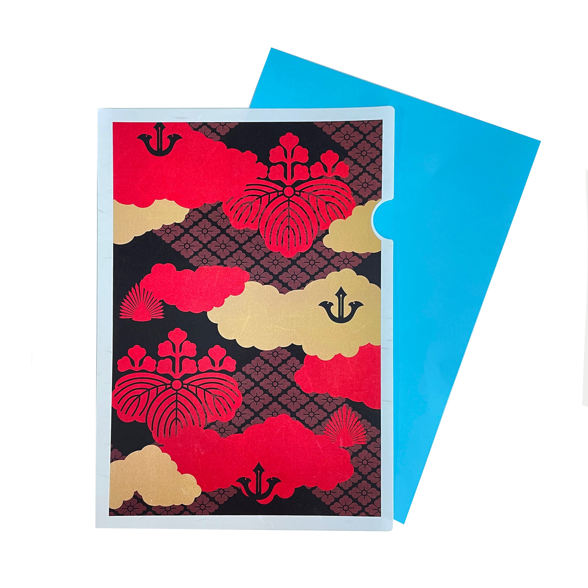 本品は、秀長にゆかりの深い家紋や兜の前立てをデザインに取り入れ、和紙の風合いと調和する色調で仕立てた和紙ファイルです。