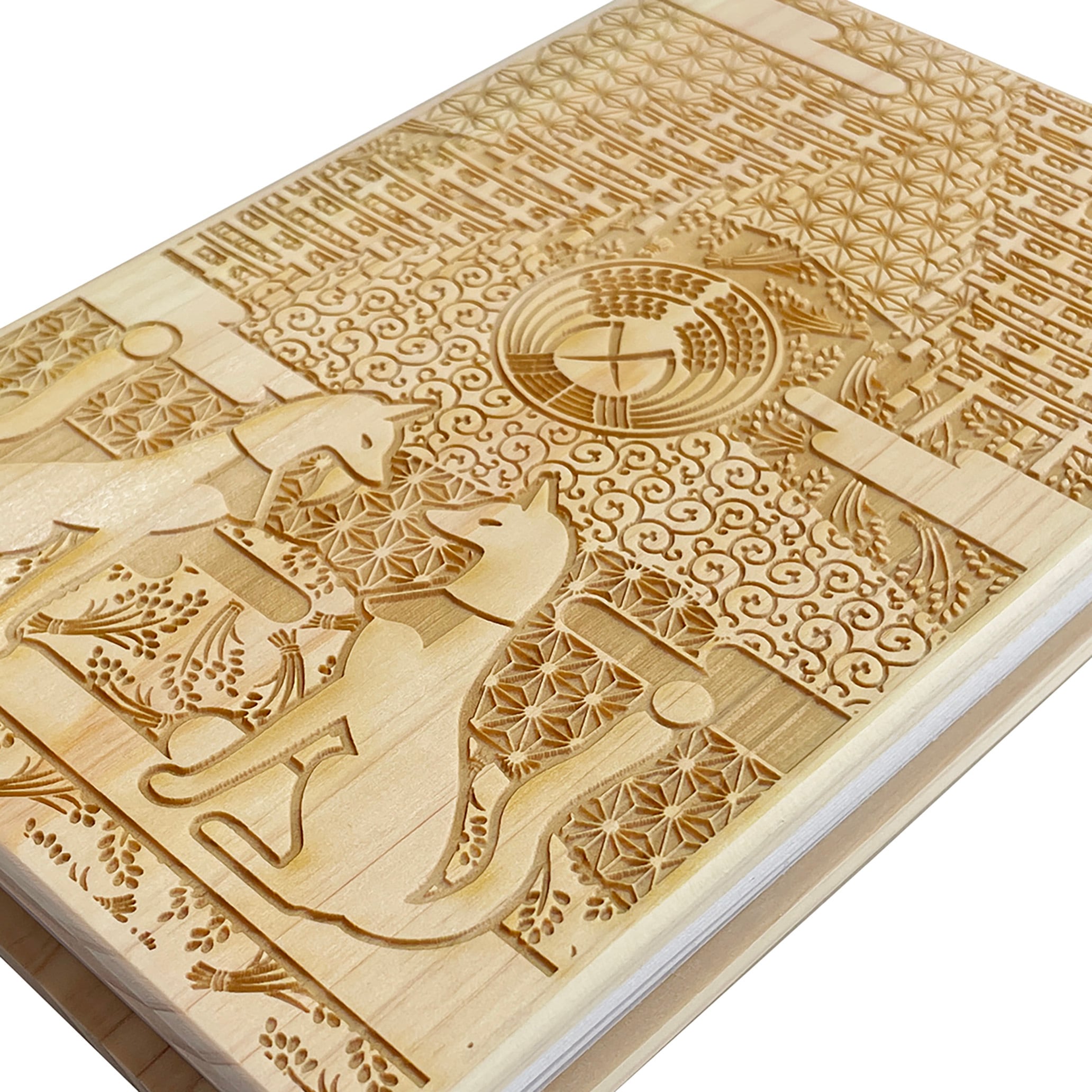 千本鳥居の朱が揺らめく稲荷神社と、願いを運ぶお稲荷さんをモチーフにした「向狐」の檜御朱印帳が新発売となりました。