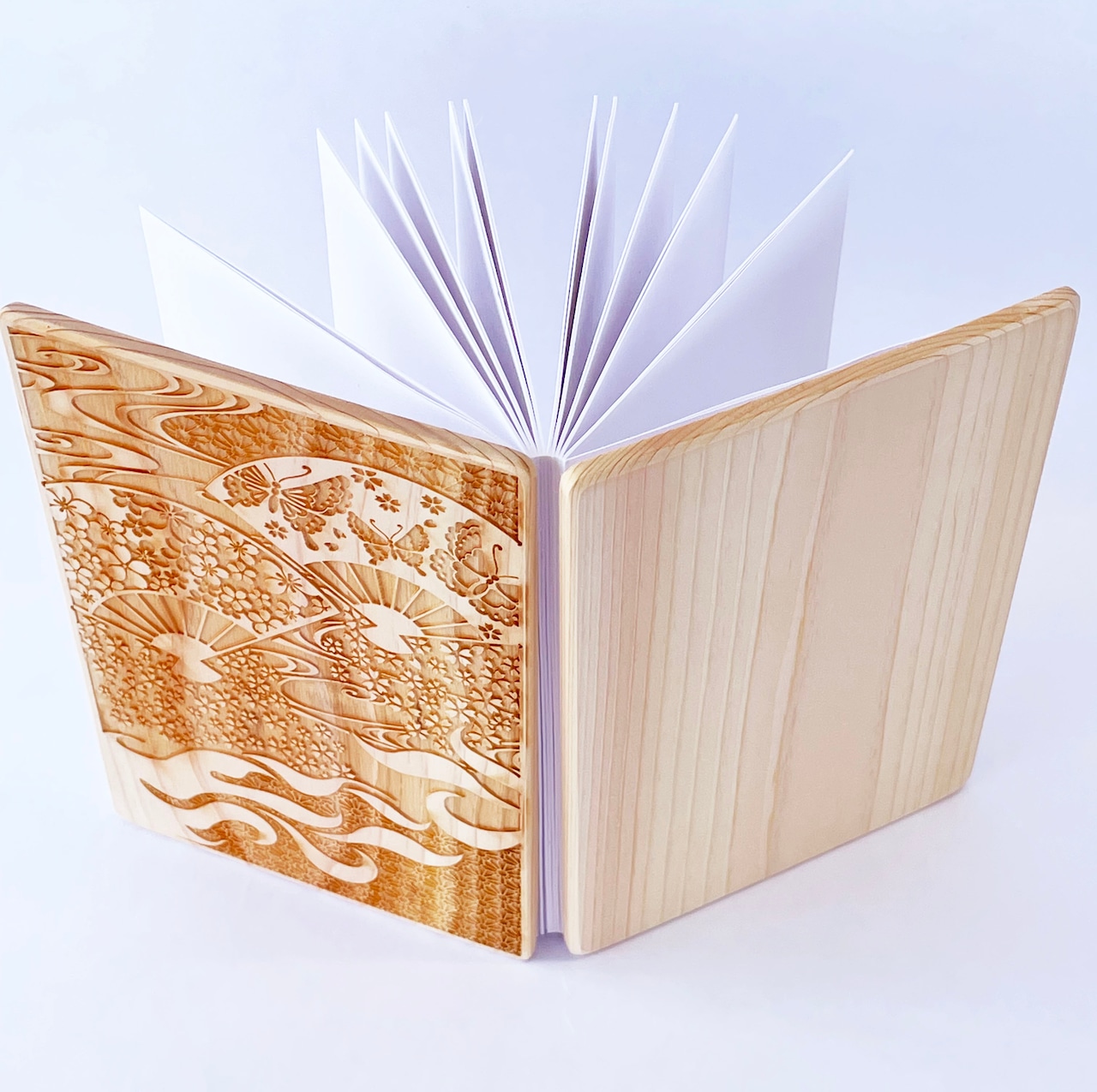 檜を使った御朱印帳です。表紙は「木花佐久夜毘売命」をイメージしました。草花や蝶のように、限りある命の儚(はかな)さや尊さを表現しており、流水のように移ろう時を描いた文様です。手に取るたびに檜が優しく香ります。使うほどに味がでる、そんな御朱印帳です。